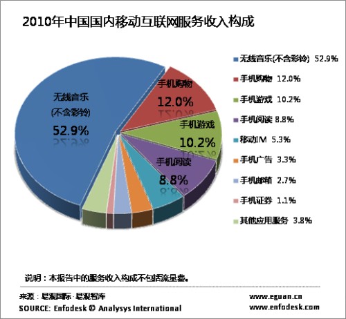 從收入構(gòu)成看來,無線音樂、手機(jī)游戲、手機(jī)閱讀逐漸成為三大主要移動互聯(lián)網(wǎng)娛樂應(yīng)用,手機(jī)購物增速明顯。