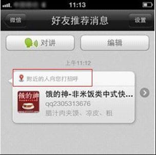 最近,網(wǎng)絡(luò)上流傳著這樣一幅截圖:一家叫“餓的神”的快餐店在午間向附近的人打招呼,以宣傳自己的快餐生意,乍一看這種形式,簡(jiǎn)直是超越了空間的電子傳單啊?磥砦⑿胚@種交友利器,已經(jīng)突破了傳統(tǒng)交流工具的定義,開始向更寬的領(lǐng)域延伸。