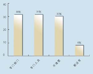 在問到實(shí)施周期上,有9家表示希望在3個月內(nèi)完成,占到47.4%,有6家接受3~6個月的周期,超過6個月的周期已經(jīng)顯得太長。在問到CRM的實(shí)施效果上,有9家認(rèn)為對公司運(yùn)營效率有很大提高,8家認(rèn)為作用一般,只有2家認(rèn)為沒有作用。表明基本上企業(yè)認(rèn)可CRM的作用。在問到是否有專門人員負(fù)責(zé)CRM時,有6家表示有專門部門,有6家有專門人員,合計占62%,說明企業(yè)非常重視CRM的應(yīng)用。