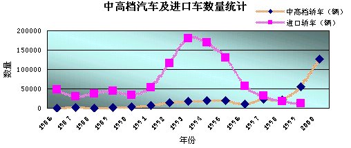 第三階段:1999年以后的快速增長階段。1999年中高檔汽車產(chǎn)銷量結(jié)束了六年的徘徊局面,首次突破5萬輛,比上年增長了1.5倍,在轎車市場中的占有率升到9.7%。2000年中高檔汽車的產(chǎn)量又實(shí)現(xiàn)翻倍,增長率為232.46%,年產(chǎn)量達(dá)到127,676臺。進(jìn)口中高檔汽車數(shù)量也超過了3萬臺,僅日本車的進(jìn)口量就達(dá)23,502臺。