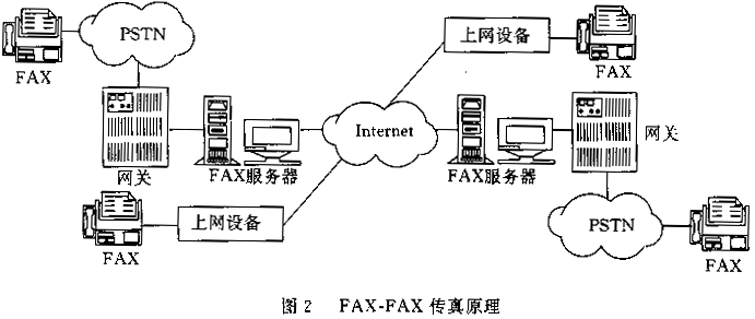 發(fā)送端傳真機與網(wǎng)關(guān)連接,通過PSTN傳送傳真,網(wǎng)關(guān)接收傳真后通過Internet傳至另一端的網(wǎng)關(guān),另一端的網(wǎng)關(guān)再通過PSTN將傳真發(fā)送給接收端傳真機。這種方式既適合存儲轉(zhuǎn)發(fā)模式,也適合實時模式,因此更加有吸引力。近年來,出現(xiàn)了一種不依賴網(wǎng)關(guān)的FAX-FAX IP傳真技術(shù),它是利用傳真機外掛一專用上網(wǎng)設(shè)備直接在Internet網(wǎng)上發(fā)送信息,原理如圖2所示。
