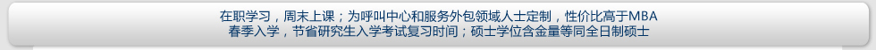 | 報(bào)名條件 | 擁護(hù)中國(guó)憲法,遵守法律、法規(guī),品行端正,身體健康,并能堅(jiān)持在職學(xué)習(xí); 大專(zhuān)及以上學(xué)歷,旨在提高本人專(zhuān)業(yè)素質(zhì)和學(xué)歷層次的 社會(huì)在職人士均可報(bào)名;擇優(yōu)錄取。 呼叫中心、服務(wù)外包領(lǐng)域的中高級(jí)從業(yè)者,英語(yǔ)基礎(chǔ)良好的人士將獲得優(yōu)先錄取機(jī)會(huì)。 |